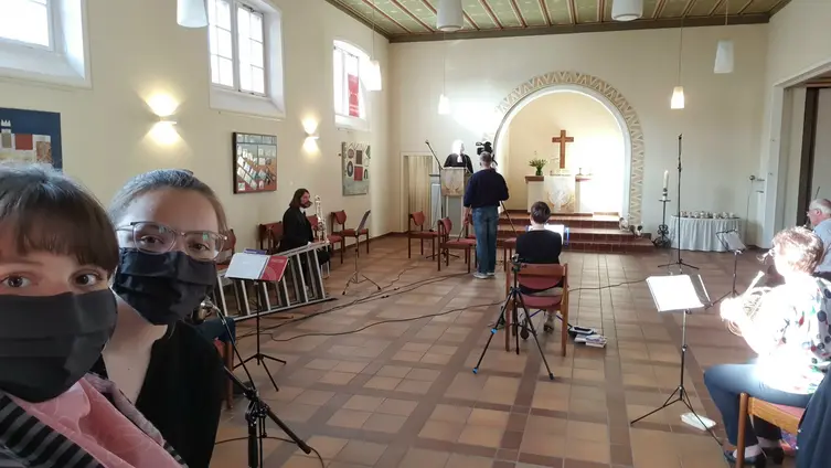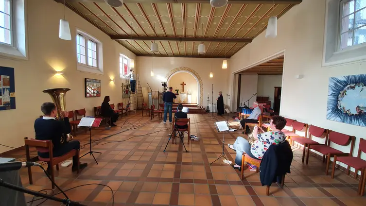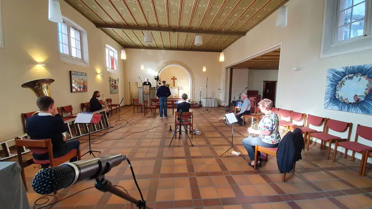 Für die Aufnahme mit unserem Posaunenchor wurde einiges an Technik aufgeboten, um alle „Köpfe und Klänge“ qualitativ hochwertig einzufangen. Viel Kreativität ist gefragt, um mit der vorhandenen Technik und unvorhergesehenen Situationen umzugehen – der Sonnenstand kümmert sich nicht um unsere Aufnahmetermine…