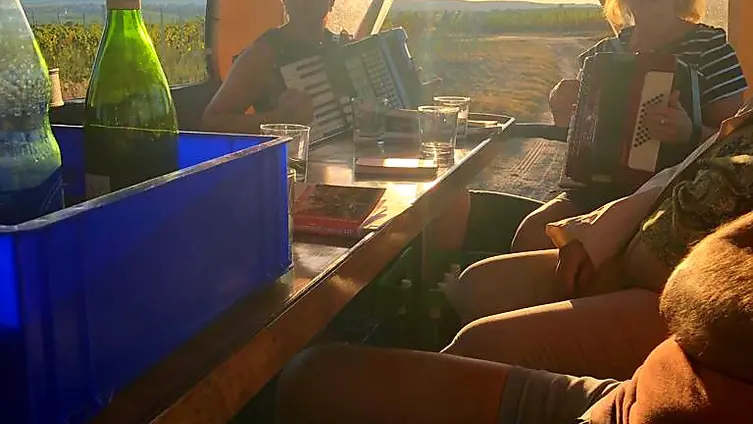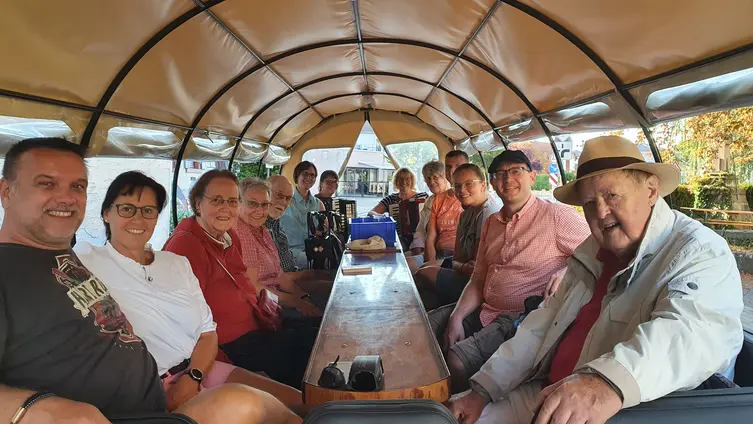 Der Rückweg nach Weisenheim am Sand wurde nun gemütlicher angegangen. Mit dem Planwagen und begleitet von Akkordeonklängen ging es singend, wie es sich für einen Chor gehört, und den Sonnenuntergang genießend ein letztes Mal durch die Pfälzer Weinberge. Nach diesem tagesfüllenden Programm fielen zwar alle erschöpft, aber mit bester Laune und vielen bleibenden Eindrücken in ihre Betten.