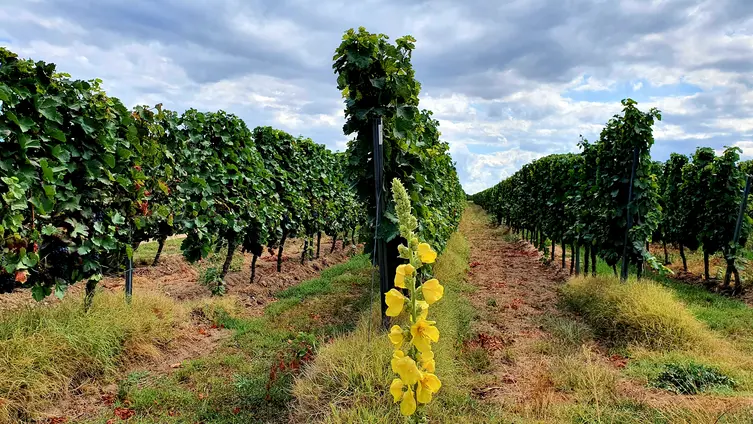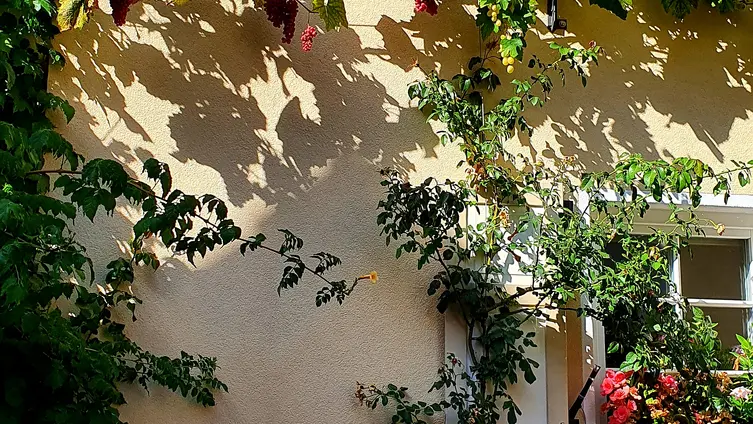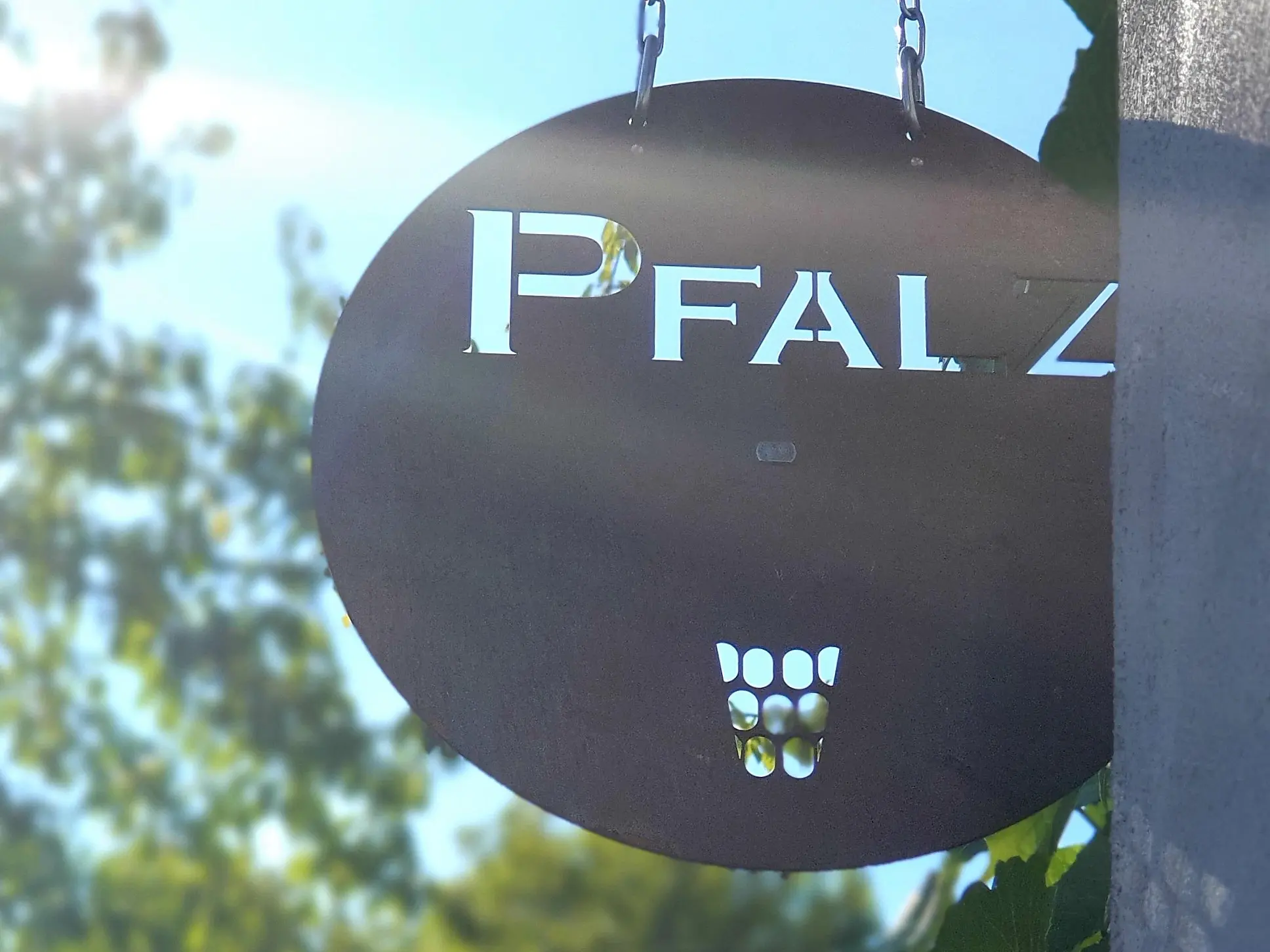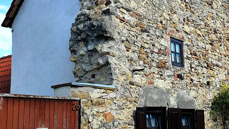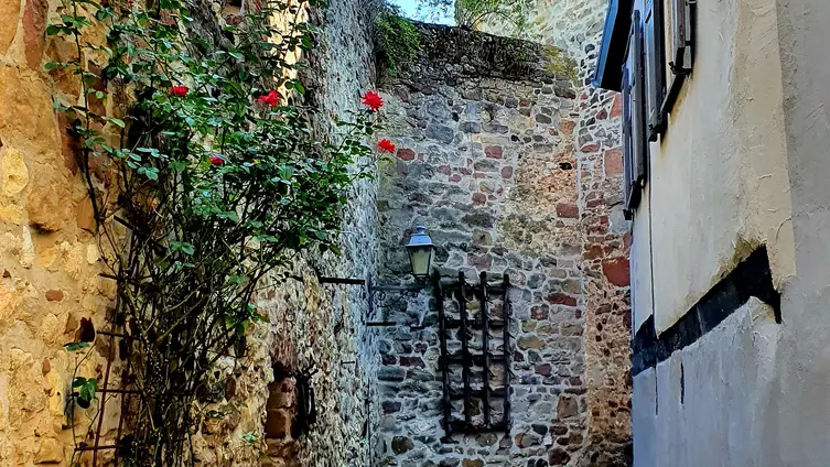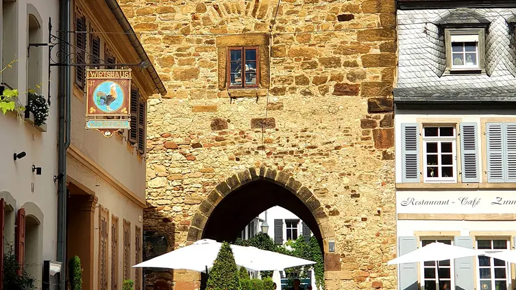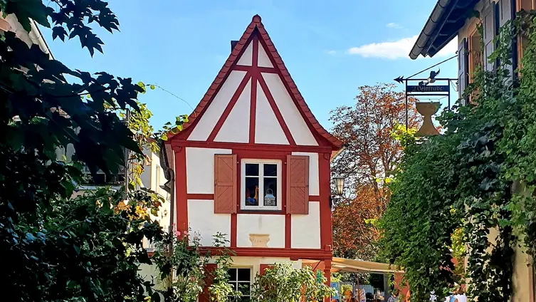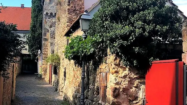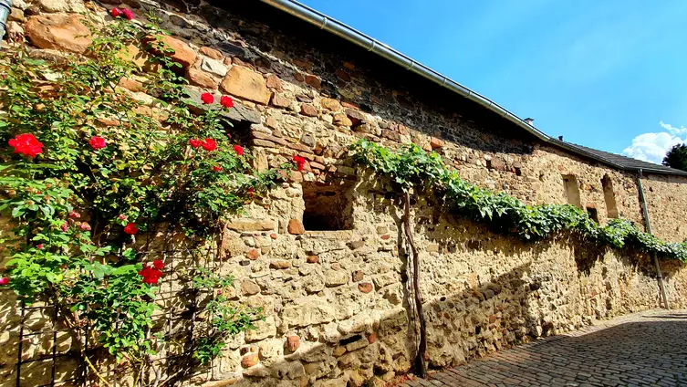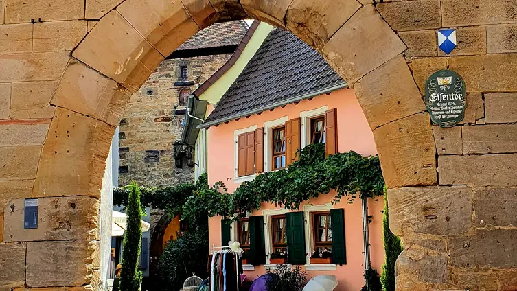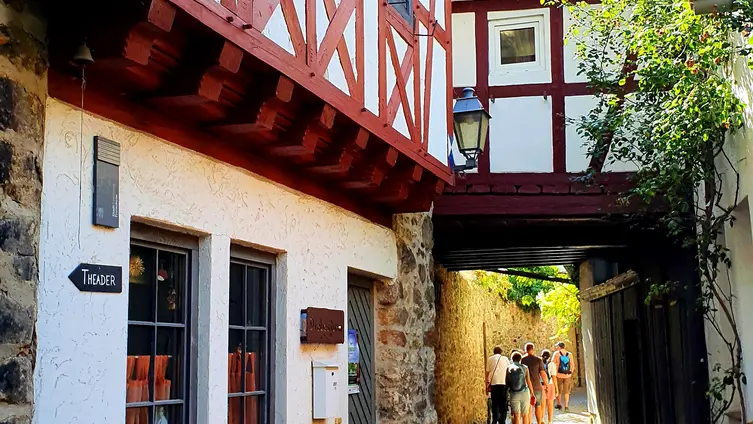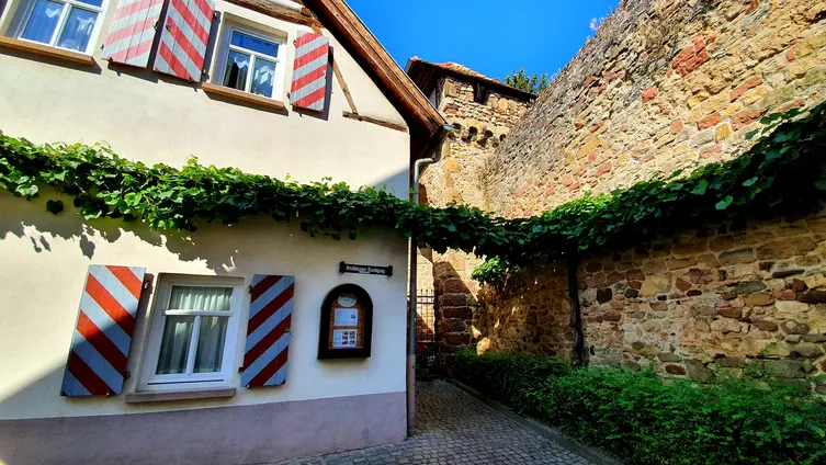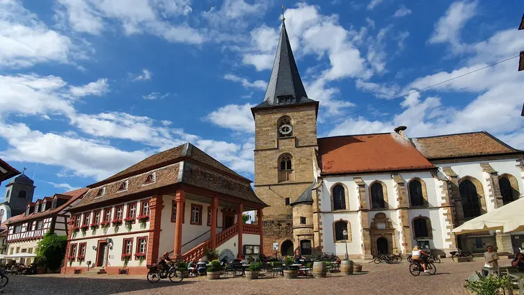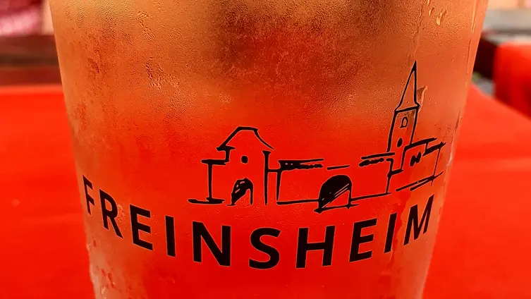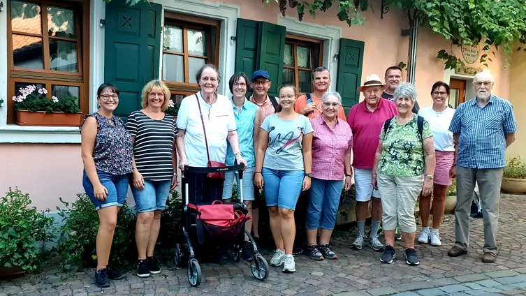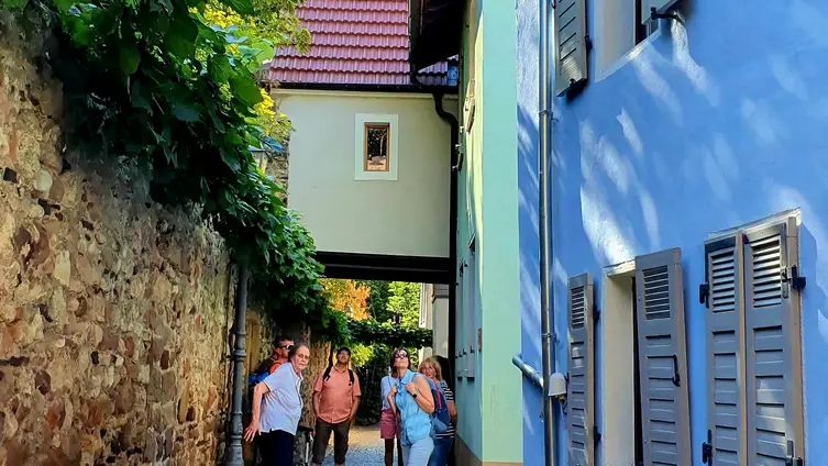 Nach gut zwei Stunden Quetsche satt ging es zu Fuß und bei munterer Unterhaltung durch die Rebenlandschaft nach Freinsheim. Dort erwartete die Gruppe ein geführter Rundgang "uff pälzisch" durch die historische Altstadt und entlang der mittelalterlichen Stadtmauer. Diese ist mit ihren Türmen und Toren fast vollständig erhalten, etwa 1000 m lang und verläuft heute an oder durch Wohnhäuser. Zu sehen waren das Rathaus, die protestantische Kirche, das Eisentor mit Flankierungstürmen und kurpfälzischem Wappen, das innere Vortor zum Eisentor, das Haintor und der Hahnenturm. Die Führung endete am Platz mit dem ältesten Haus der Stadt und dem ehemaligen Eichbrunnen. Hier kehrten die Reisenden in die „Weinstube an der Bach“ ein und ließen sich bei einer Weinschorle die Spezialitäten aus der Pfalz schmecken.