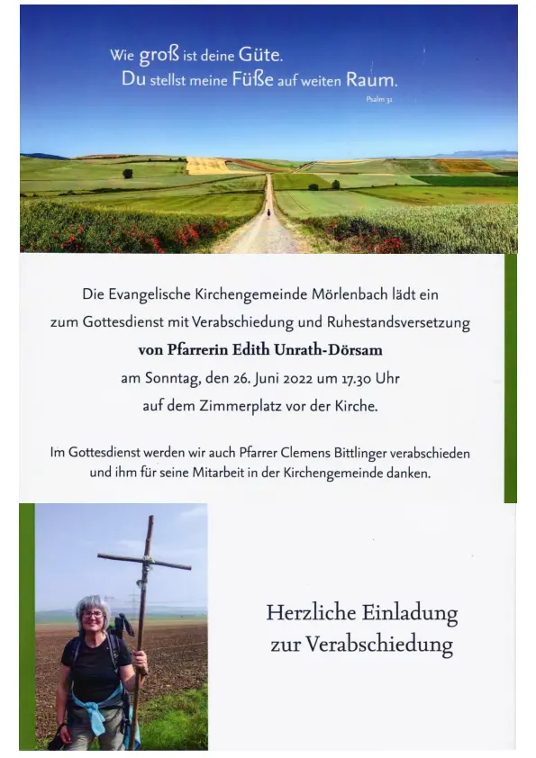 Ab dem 1. Juli werde ich nicht mehr Gemeindepfarrerin sein, aber die vielen gewachsenen Beziehungen werden – so hoffe ich sehr – weiter bestehen. Gott behüte und segne Sie und Ihre Lieben!