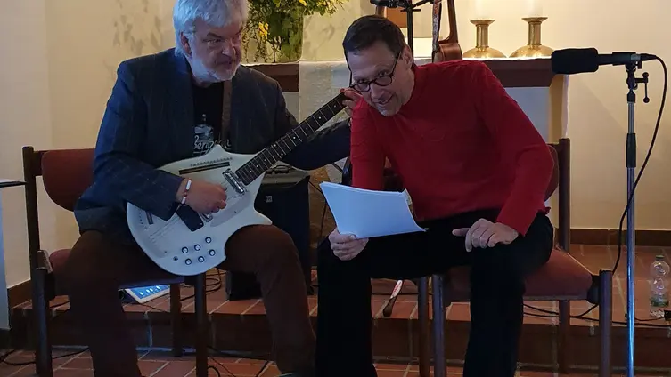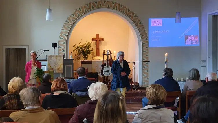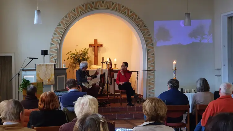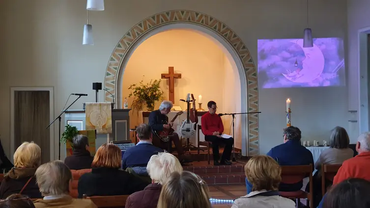 Im Rahmen von Kunst in der Kirche präsentierten sich "Zwei Männer im Mond", Adax Dörsam und Mathias Wendel, mit Musik und Texten über Mond und Sterne und die Faszination der Nacht. Die beiden gingen auf Mondreise, zeitweise gemeinsam mit "Peterchen". Dabei erklang u. a. Musik von Dörsam, Mancini, Monroe oder Biermann und Texte u. a. von Bassewitz, Schubiger, Celan, Bayer, Bachmann und Wendel.