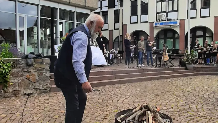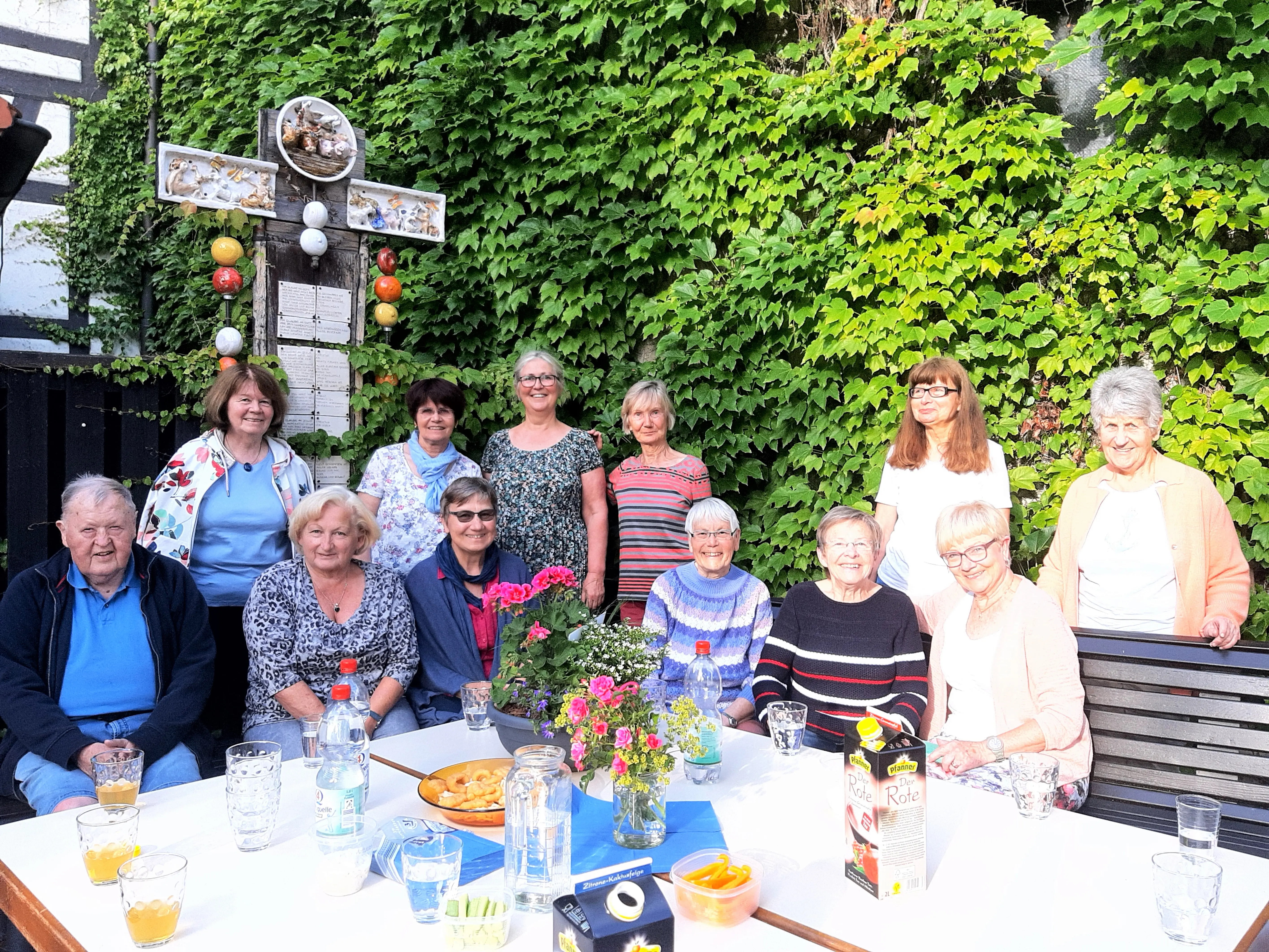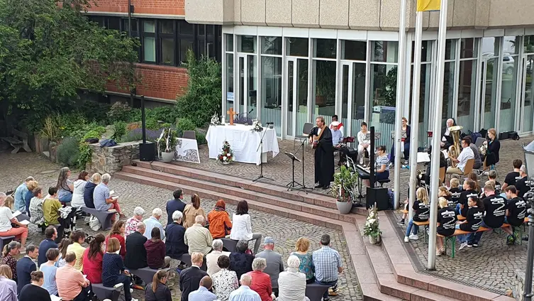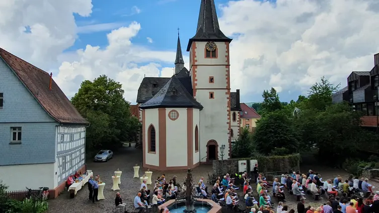 Nach den Dankesworten von Helmut Sürie und Pater Cyril an die Musiker*innen, Organisator*innen und Helfer*innen wurde im Anschluss zu „Weck, Worschd unn Woi“ in den kath. Pfarrgarten eingeladen. Dieser Einladung kamen die Konzertbesucher*innen gerne nach und es wurde noch nett geplaudert.