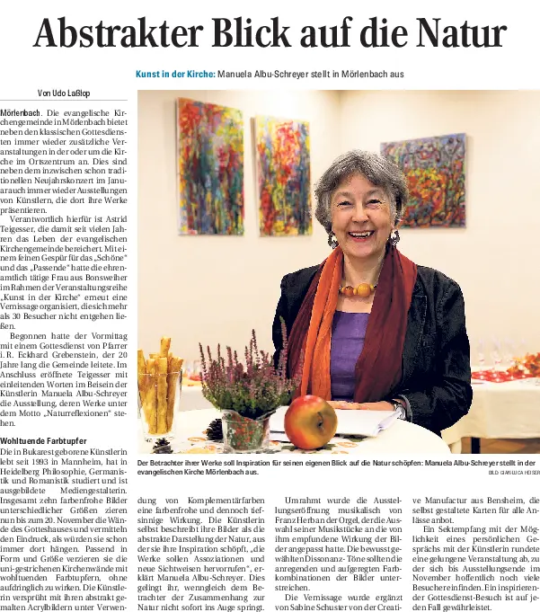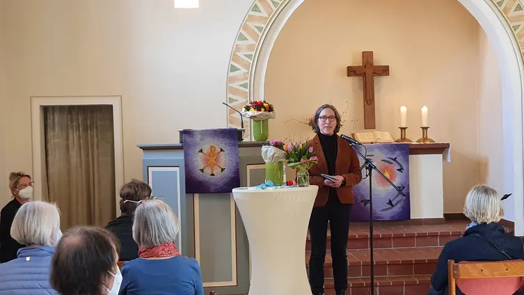 Astrid Teigesser begrüßte die Freund*innen von "Kunst in der Kirche" herzlich zu einer ganz besonderen Ausstellung in unseren Kirchenräumen – besonders deshalb, weil in den Bildern eine sehr persönliche, aber auch Mut machende Geschichte erzählt wird.