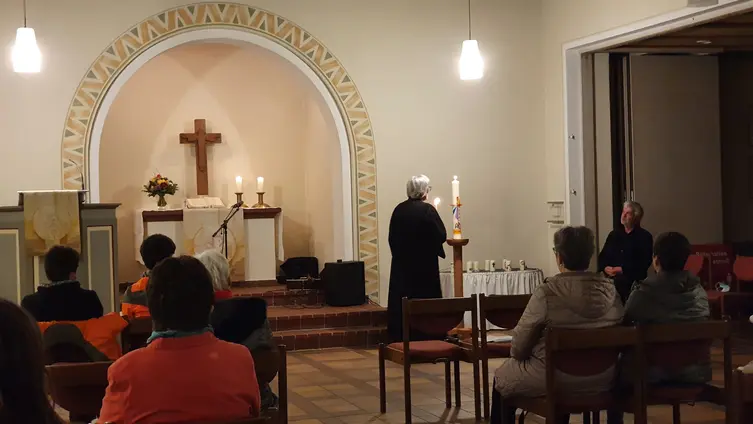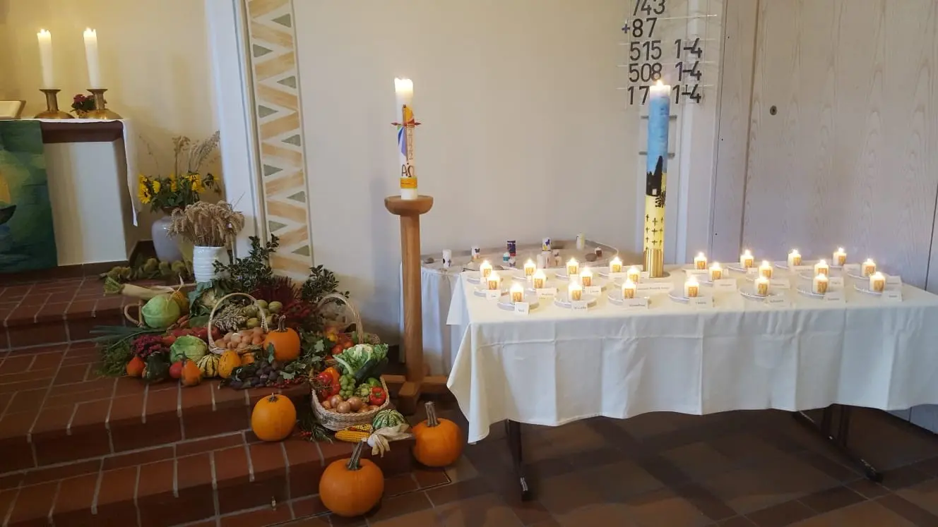 In der Andacht wurde die „Wanderfriedenskerze“ angezündet. Im Rahmen einer Aktivität der evangelischen und katholischen Kirche in Hessen und Rheinland pfalz „wandert“ diese Kerze im Oktober und November durch etwa 80 Gemeinden und führt Menschen unterschiedlichster Konfessionen zusammen, um für den Frieden zu beten. Daneben haben die Teilnehmer am Friedensgebet für jeden Kriegsort in der Welt 22 Kerzen entzündet und an jeder Kerze den Kriegsort verzeichnet.