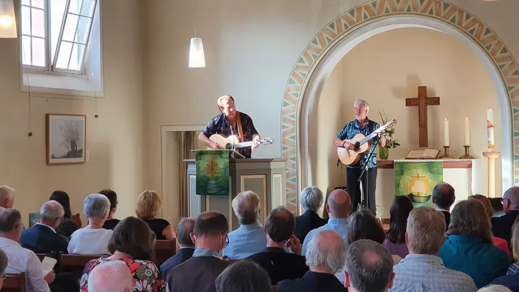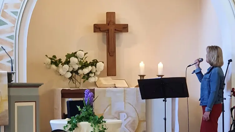 Bettina Alms – eine musikalische Ausnahmepersönlichkeit war zu Gast in unserer Gemeinde. Gemeinsam mit Pfarrer Clemens Bittlinger an der Gitarre und Carolin Raschke am Klavier gestaltete sie den Gottesdienst am Sonntag Kantate.