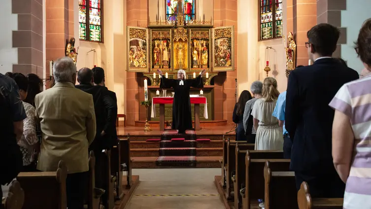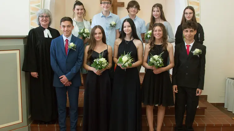 Der Gottesdienst begann mit dem langen Einzug durch den Mittelgang, begleitet von einer festlichen Intrade des Posaunenchors. Pfarrerin Unrath-Dörsam hieß die Gemeinde willkommen, woraufhin das Lied „Eingeladen zum Fest des Glaubens“ gesungen wurde. Das Glaubensbekenntnis nach der Frage an die Konfirmand*innen wurde nicht nur gesprochen, sondern auch musikalisch mit „Ich sage Ja“ bekräftigt. Die Einsegnung der jungen Damen und Herren wurde durch Handauflegen der Eltern unterstützt. Kurzes Luftanhalten gab es bei dem ein oder anderen Kleid, das nach dem Knien fast den Absätzen der schicken Schuhe zum Opfer gefallen wäre. Nach dem Überreichen der Urkunden und Geschenke sangen Birgit und Carolin Raschke ihre Wünsche für die Konfirmand*innen. Rund um den Altar feierten die Jugendlichen ihr erstes Abendmahl, was durch das gemeinsame Lied „So soll es sein“ bekräftigt wurde. Die Grußworte des Kirchenvorstands sprach Birgit Raschke, die den Konfirmierten von neuen Wegen, Navigationssystemen und bequemen Schuhen erzählte. Im Wechsel von Orgel und Posaunenchor wurde zum Abschluss der Klassiker „Nun danket alle Gott“ gesungen und nach dem Segen spielte Carolin Raschke einen fetzigen Auszug, der zum „Raustanzen“ einlud.
