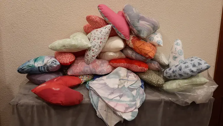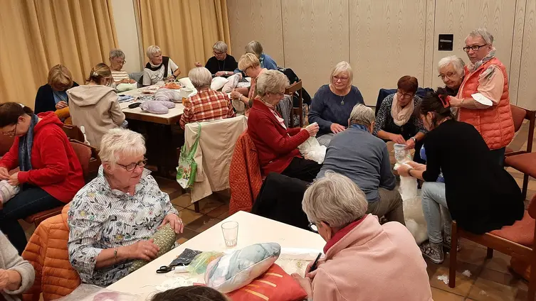 Die einfühlsamen Texte wurden durch Orgelklänge von Christin Raschke untermalt und berührende Liedtexte wie „Ein freundlicher Blick für alle, die suchen, die gebende Hand für Menschen in Not, ein liebendes Herz für Menschen die fremd sind, so öffnen sich Türen, das Leben beginnt“ verstärkten das Ansinnen der Frauen. Denn im Anschluss an den Gottesdienst wurden von 44 fleißigen Händen im Gemeindesaal Herzkissen genäht, die den Brustkrebs-Patientinnen der GRN-Klinik in Weinheim nach einer Operation überreicht werden.