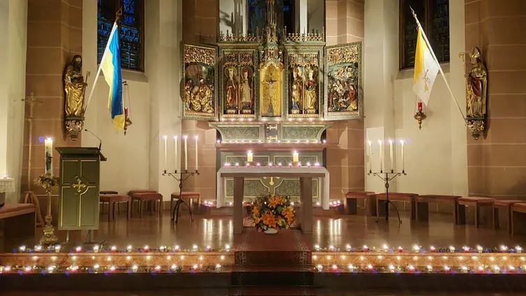 Die nächste Gebetsstation war die evangelische Kirche. Vor dem Altar stand ein Tisch mit 22 Kerzen, die an die aktuellen Kriegsorte in der Welt mahnten. An jeder Kerze war ein Hinweis auf den jeweiligen Kriegsort. Helmut Sürie hielt Fürbitte für den Frieden in der Welt. Zum Abendsegen versammelten sich die Gottesdienstbesucher wieder in Sankt Bartholomäus.