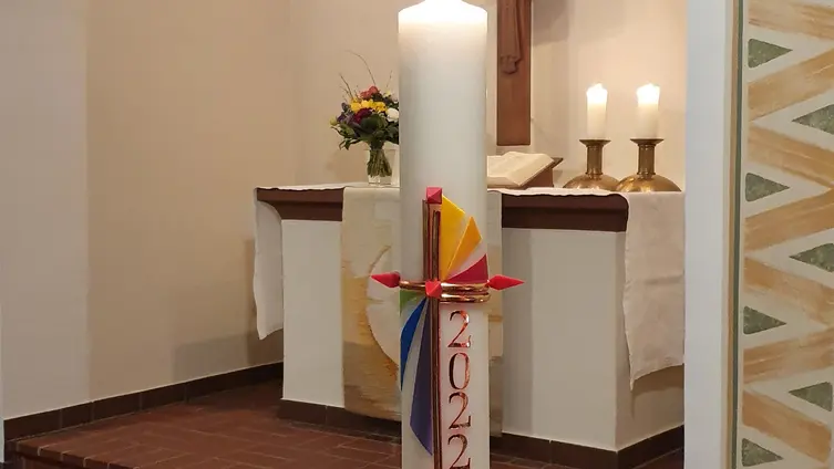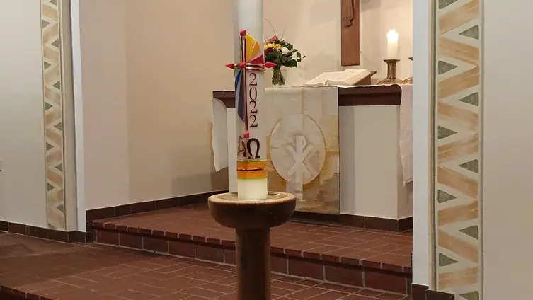Premiere: der neue Kerzenständer für die Osterkerze wurde exklusiv für unsere Kirchengemeinde angefertigt! Herr Dörsam aus Steinbach, Schwager unserer Kirchenvorsteherin Birgit Raschke, hat aus einem massiven Eichenstamm dieses Unikat eigenhändig geschaffen, dafür ein herzliches Dankeschön! Mit diesem neuen, modernen Unterbau kommt die schöne Osterkerze noch besser zur Geltung.
