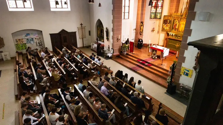 In der mit hunderten von Kerzen feierlich beleuchteten katholischen Kirche Sankt Bartholomäus zelebrierte Pater Cyril die Abendandacht. Passende Texte zur Motivation für den Frieden und gegen kriegerische Auseinandersetzungen in der Welt sowie Verse aus dem Johannes-Evangelium wurden gelesen und der Song „Frieden“ von Reinhard Mey erklang. Das Fürbittengebet leitete Helmut Kadel mit einer Komposition auf dem Dudelsack ein. Nach dem gemeinsamen Vaterunser und einem Schlußgebet zog die Gemeinde durch den Ostchor aus der Kirche aus und entzündete auf dem Rathausplatz die Kerzen.