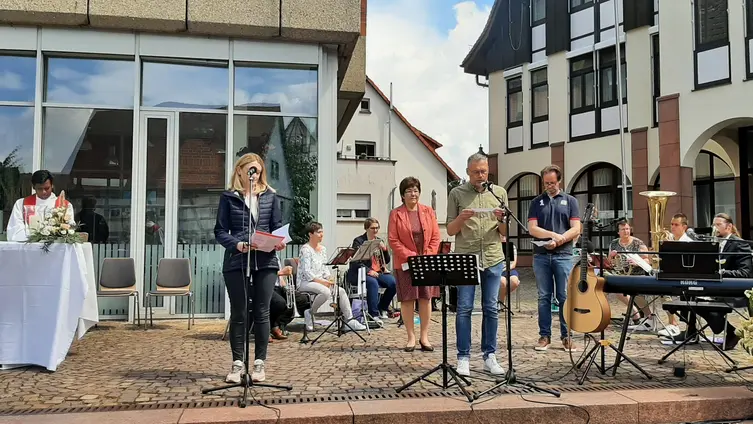 Das Bläserensemble Lauda Sion aus Weiher begleitete die Prozession auf dem Weg zur Schloßhofschule. Dort wurden Friedenstexte vorgetragen und ein Gebet gesprochen.